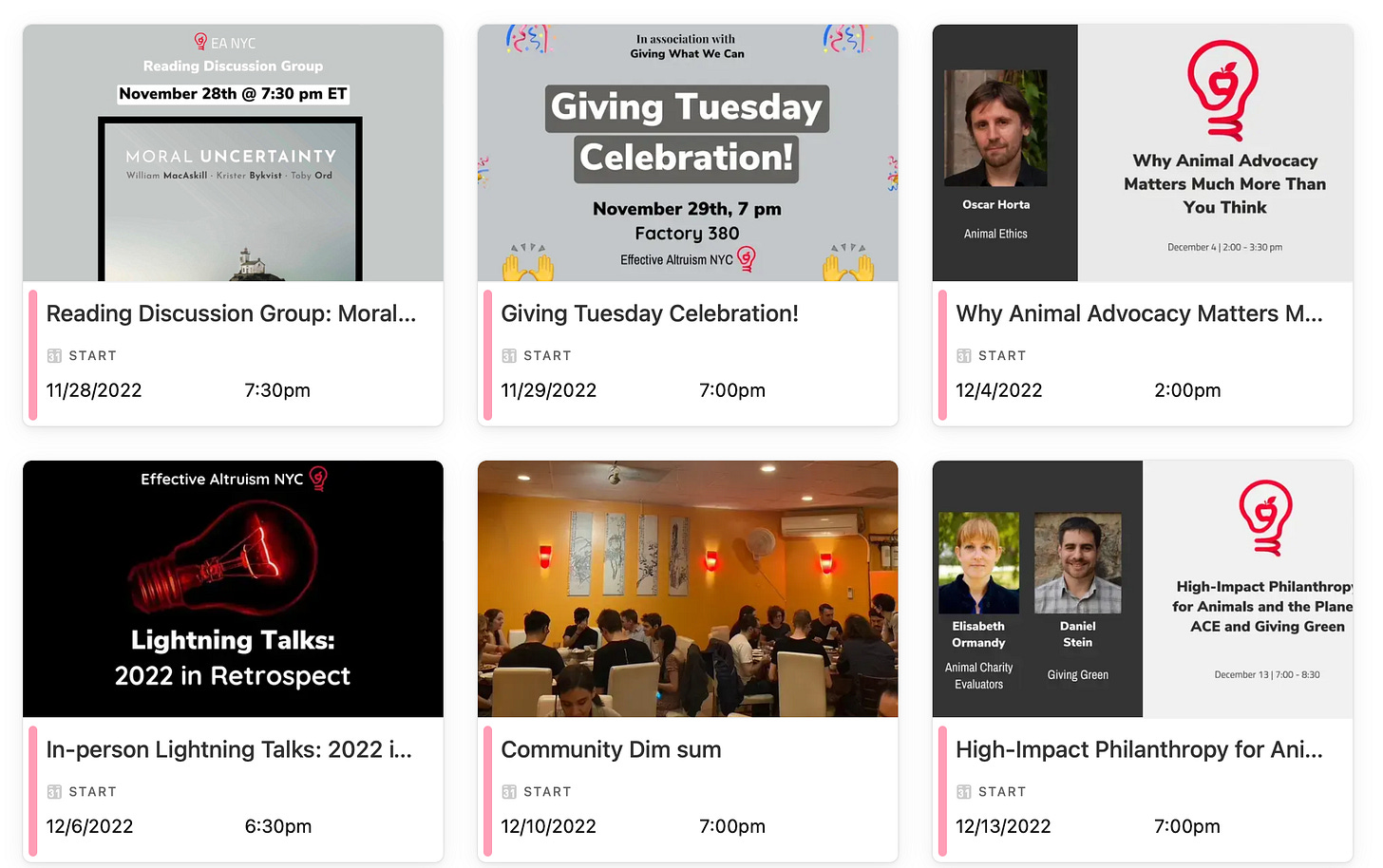 Join EA NYC Director Rocky on Thursdays using this Zoom link. From career advice to understanding EA concepts to anything else on your mind, stop by and chat!